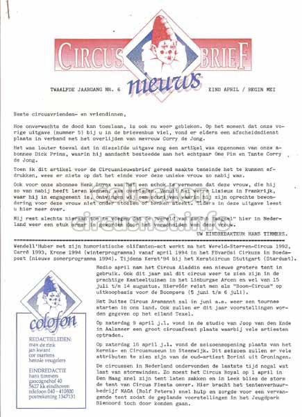 2225 revues Nous conservons ce qui vient des cirques, mais aussi ce qui en parle, comme les revues, tel cet exemplaire de “Circus nieuws Brief” datant de 1994 |