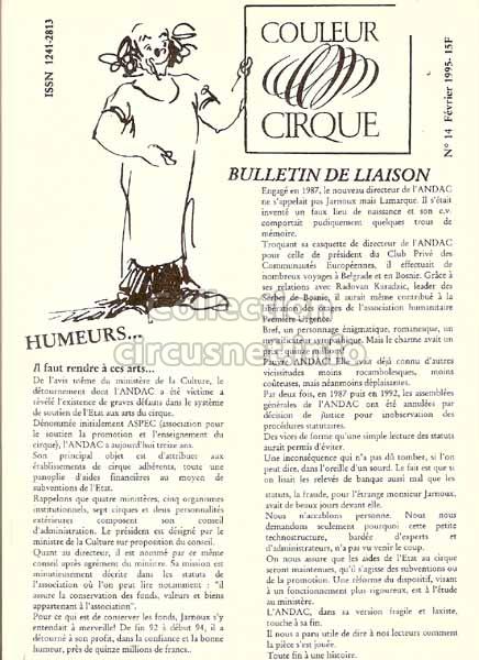 2210 journals We gather documents coming from circuses, but also related to circus, as this issue of the “La Revue Couleur Cirque” journal, published in 1995 |